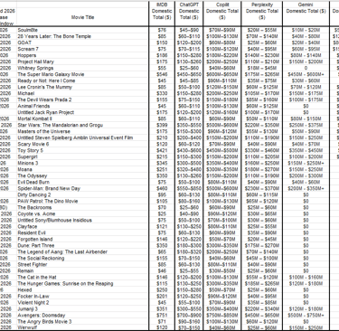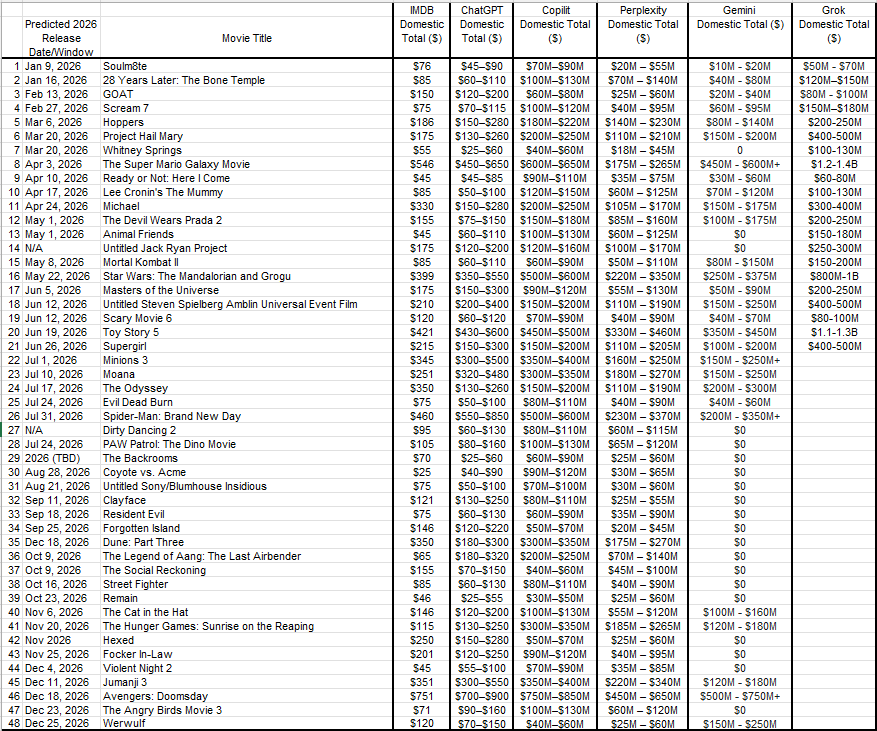We built the list from IMDb’s confirmed 2026 theatrical releases, then provided each AI the same prompt: forecast total domestic grosses based on public data such as release date, franchise history, and genre trends.